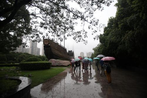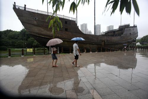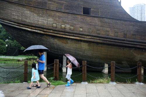 2020年7月11日,江苏省南京市民和外地游客在南京宝船厂遗址公园观赏“郑和宝船”模型。当日是中国航海日,南京宝船厂遗址公园免费开放。坐落于600年前的龙江宝船厂遗址之上的宝船遗址公园是南京市为纪念郑和下西洋600周年投资开发的一座融旅游、纪念、展览、休闲为一体的大型遗址性公园。总投资6亿元人民币。2005年7月一期工程建成开放。宝船长148米,宽60米。
