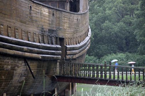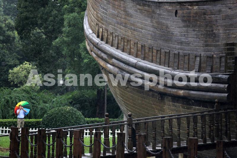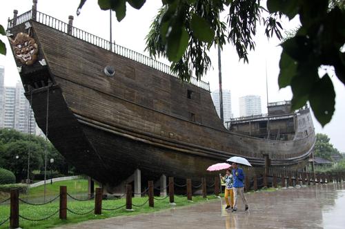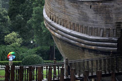 7月11日,游人在江苏省南京市的宝船厂遗址公园里观赏郑和宝船模型。