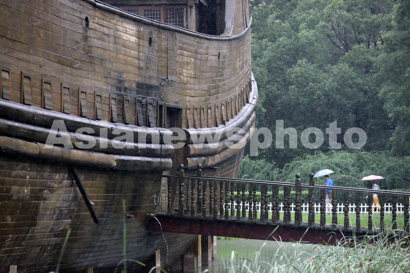 7月11日,游人在江苏省南京市的宝船厂遗址公园里观赏郑和宝船模型。