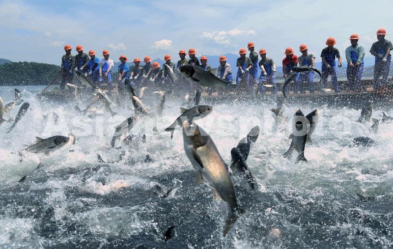 图片说明:7月12日,浙江省杭州市淳安县千岛湖开展新安江大坝泄洪后的第一场巨网捕鱼,丰收5万余斤“胖头鱼”。