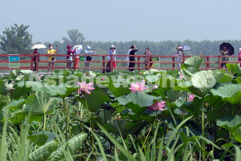 2020年7月15日,辽宁沈阳,夏日的七星湿地荷花盛开、水岛相映、绿树成荫、小桥流水,自然风光非常优美。怡人的自然湿地景观吸引众多游客观光亲近自然,感受湿地魅力。