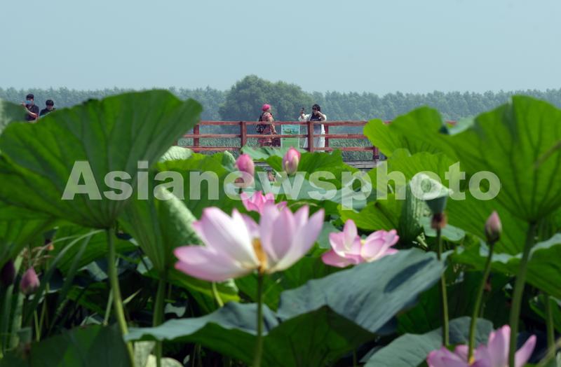 2020年7月15日,辽宁沈阳,夏日的七星湿地荷花盛开、水岛相映、绿树成荫、小桥流水,自然风光非常优美。怡人的自然湿地景观吸引众多游客观光亲近自然,感受湿地魅力。