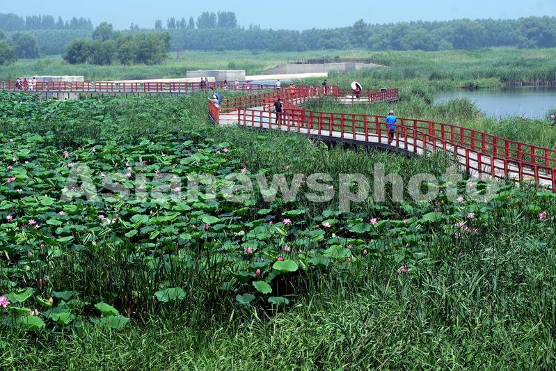 2020年7月15日,辽宁沈阳,夏日的七星湿地荷花盛开、水岛相映、绿树成荫、小桥流水,自然风光非常优美。怡人的自然湿地景观吸引众多游客观光亲近自然,感受湿地魅力。