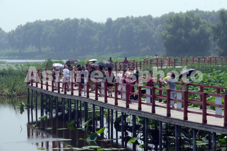 2020年7月15日,辽宁沈阳,夏日的七星湿地荷花盛开、水岛相映、绿树成荫、小桥流水,自然风光非常优美。怡人的自然湿地景观吸引众多游客观光亲近自然,感受湿地魅力。