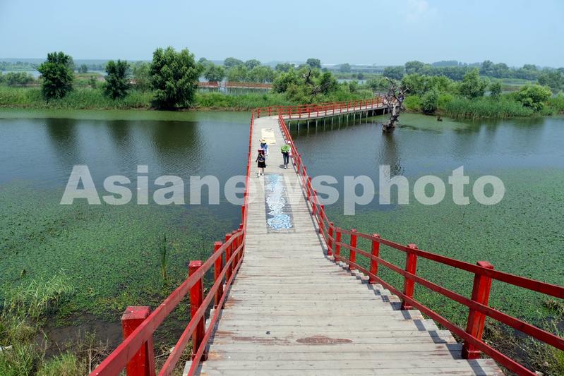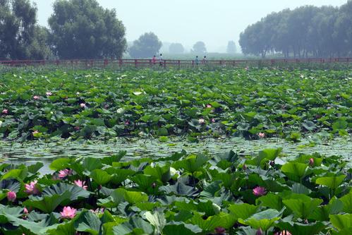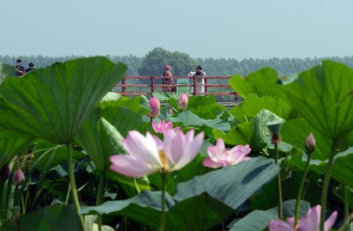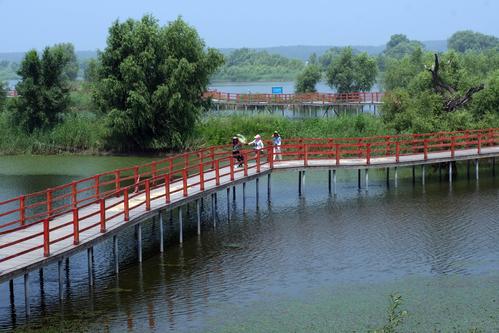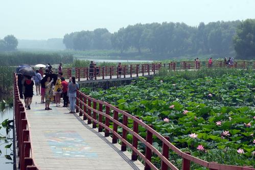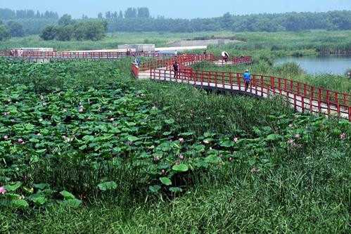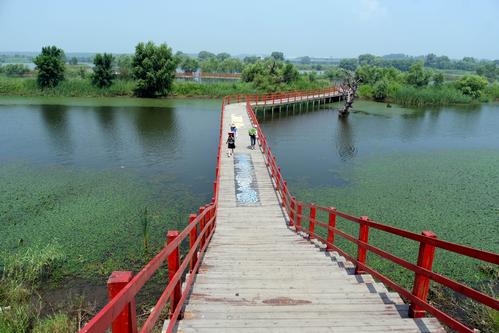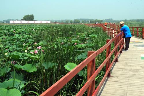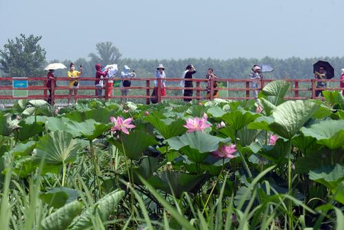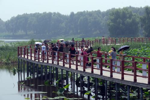 2020年7月15日,辽宁沈阳,夏日的七星湿地荷花盛开、水岛相映、绿树成荫、小桥流水,自然风光非常优美。怡人的自然湿地景观吸引众多游客观光亲近自然,感受湿地魅力。