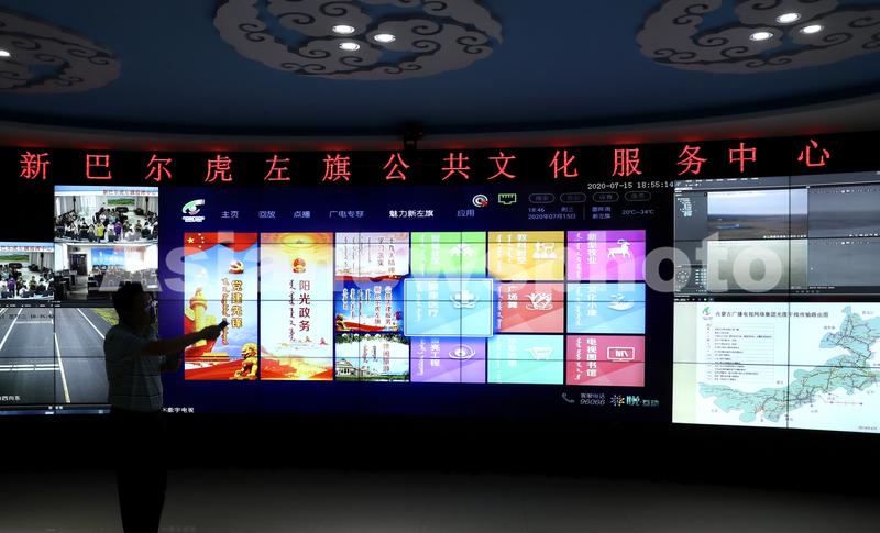 7月15日,内蒙古呼伦贝尔市新巴尔虎左旗公共文化服务中心。从2018年开始,新巴尔虎左旗实施了公共文化服务与新型智慧牧区建设项目,采用有线无线融合网的方式覆盖75%的地域面积,95%以上牧区用户不但能收看到高清电视节目,还能享受医疗卫生、法律服务等多种服务。