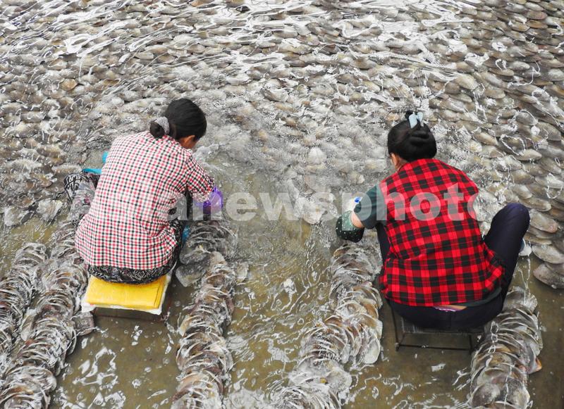 2020年7月19日,连云港市连云区高公岛街道一家紫菜育苗厂,养殖户正在对条斑紫菜壳孢子进行洗刷作业。