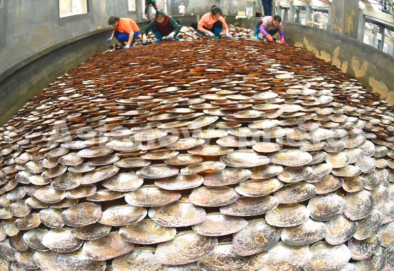 2020年7月19日,连云港市连云区高公岛街道一家紫菜育苗厂,养殖户正在摆放附有条斑紫菜壳孢子的贝壳。