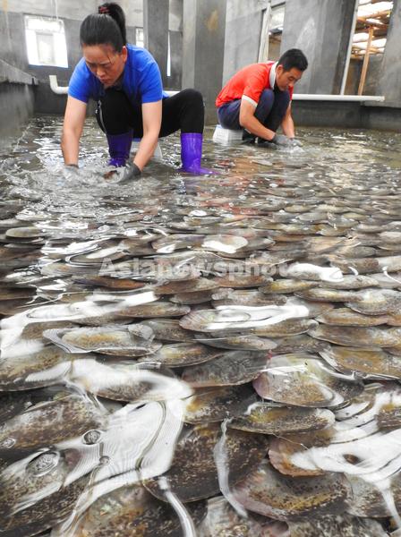 2020年7月19日,连云港市连云区高公岛街道一家紫菜育苗厂,养殖户正在对条斑紫菜壳孢子进行洗刷作业。