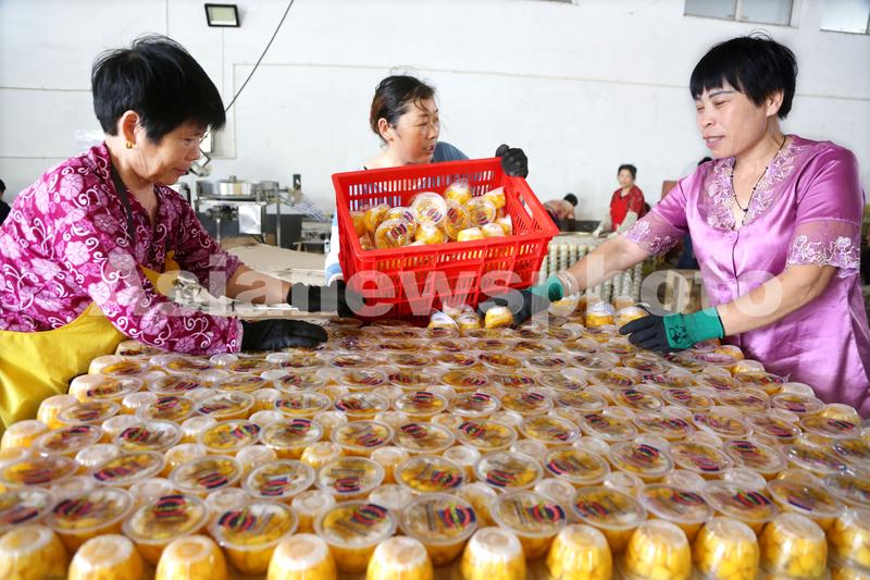 图片说明:7月20日,连云港市朝阳街道一食品厂车间内,工人正将加工好的外贸订单罐头进行包装。