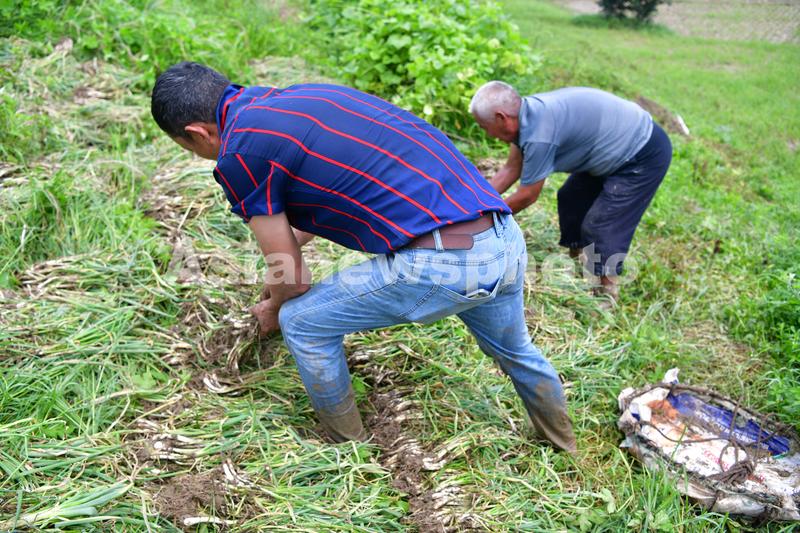 2020年7月20日,在阜南县王家坝镇,两村民在收拾蓄洪区内自己家种植的大葱。