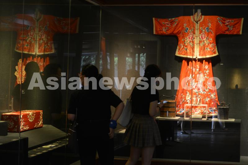 图片说明:2020年7月23日,在江苏省南京市民俗博物馆,游客参观南京传统婚嫁习俗中使用的新娘衣裙。