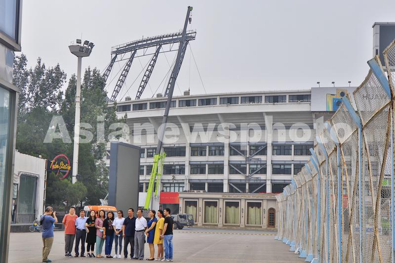 7月29日,北京工人体育场将正式启动保护性改造复建,图为工作人员在拍照留念。