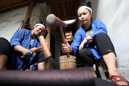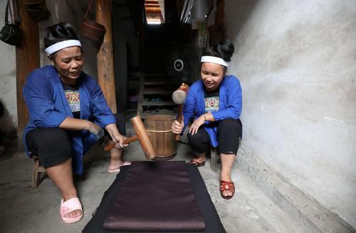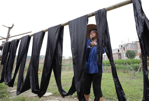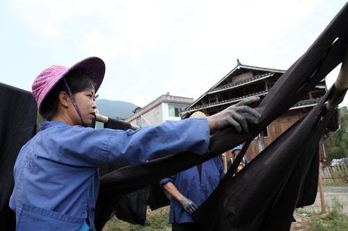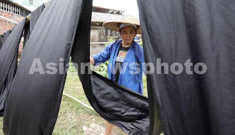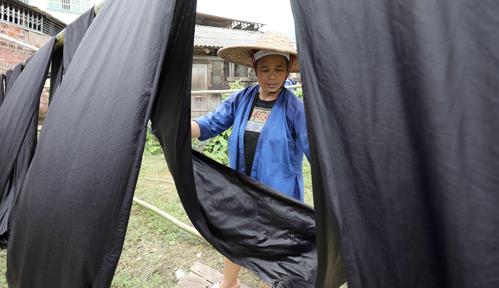 大暑过后,广西三江侗族自治县迎来染制侗布的“黄金季”,走进侗寨,随处可见村里晾满“侗布”。侗布是侗家人用蓝靛自制染料,用自织布匹经反复染、洗、晒、蒸、捶,并用牛皮膏、鸡蛋清等增亮而制成,是侗家人制作传统服饰的主要面料,也是侗家儿女婚嫁时馈赠亲友的礼品。