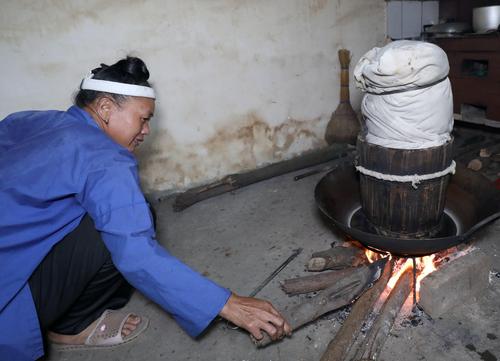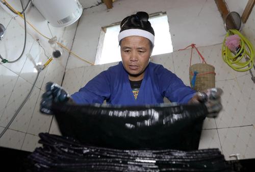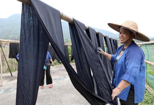 7月29日,在广西三江侗族自治县良口乡南寨村,一名妇女在晾晒侗布。
