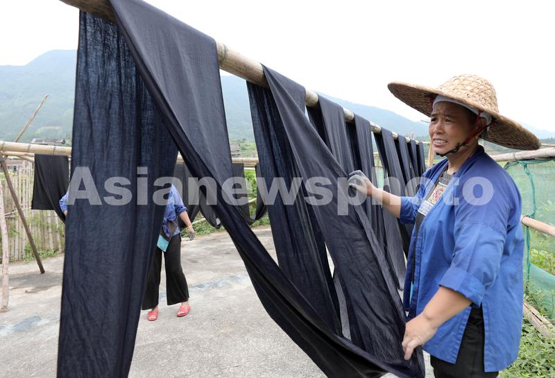 7月29日,在广西三江侗族自治县良口乡南寨村,一名妇女在晾晒侗布。