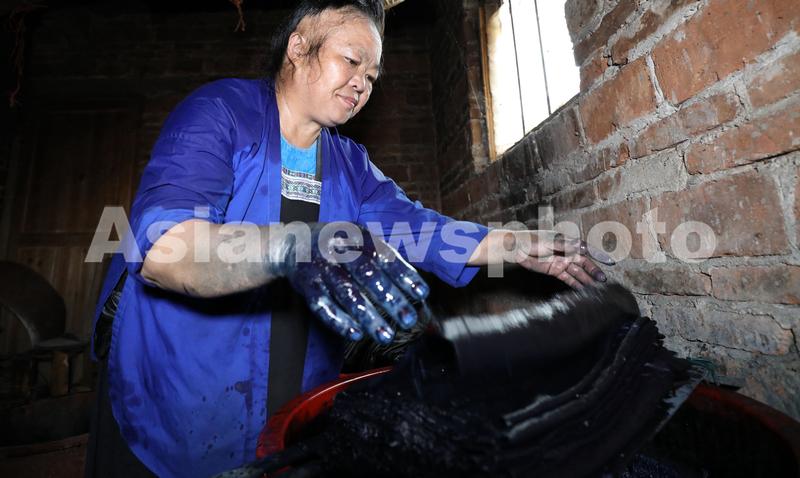 7月29日,在广西三江侗族自治县良口乡南寨村,一名妇女在染侗布。