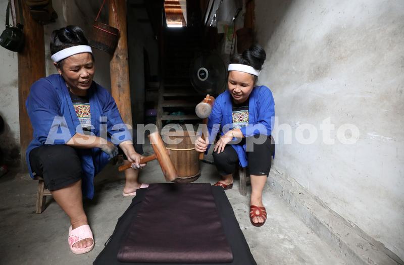 7月29日,在广西三江侗族自治县良口乡南寨村,两名妇女在捶侗布。