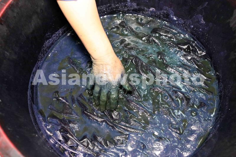 7月29日,在广西三江侗族自治县良口乡南寨村,一名妇女在染侗布。
