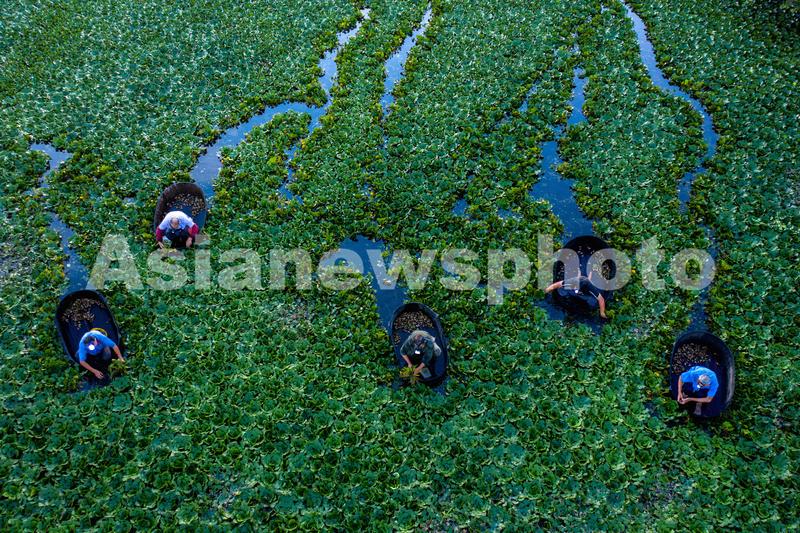 图片说明:2020年8月3日清晨,浙江省湖州市长兴县夹浦镇陶家湾村帮扶基地,菱农划着菱桶采收菱角。