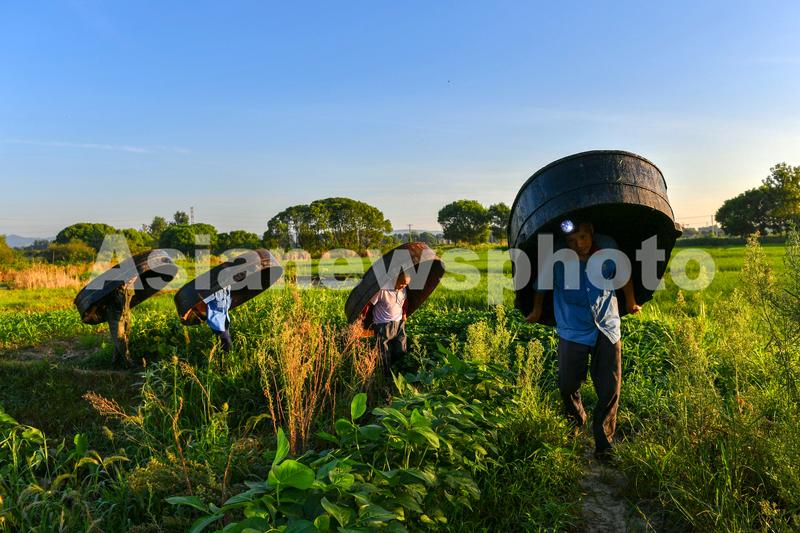 图片说明:2020年8月3日清晨,浙江省湖州市长兴县夹浦镇陶家湾村帮扶基地,菱农在搬运菱桶。