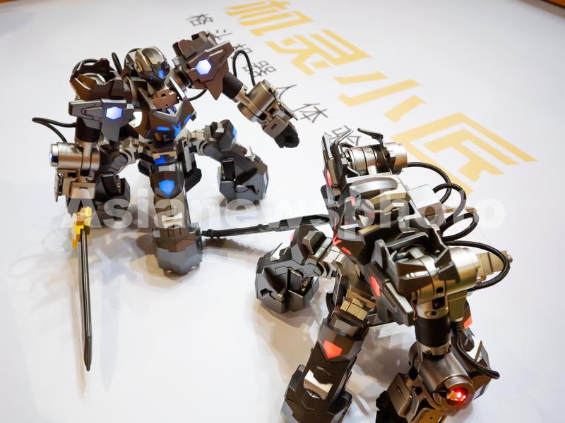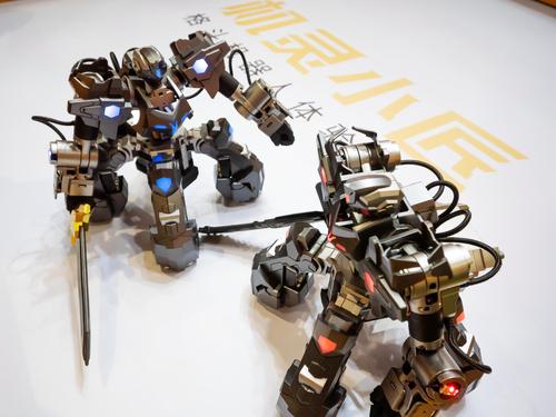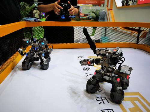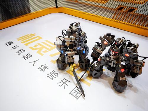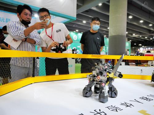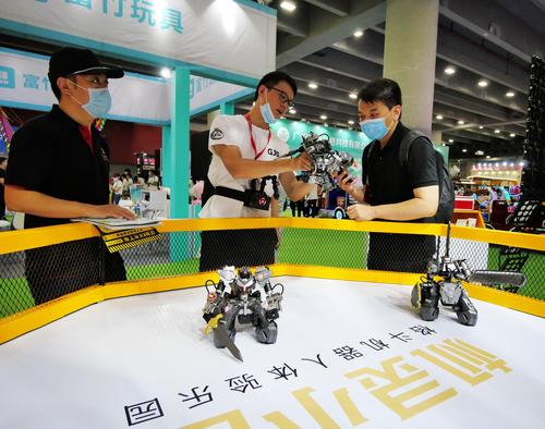 2020年8月3日,广东广州,2020亚洲视觉智能产业展上,观众现场体验格斗机器人,通过遥距感应机器人可以随意移动用手上的武器进行对决。
