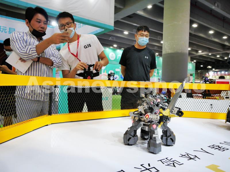 2020年8月3日,广东广州,2020亚洲视觉智能产业展上,观众现场体验格斗机器人,通过遥距感应机器人可以随意移动用手上的武器进行对决。