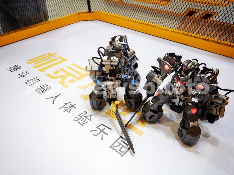 2020年8月3日,广东广州,2020亚洲视觉智能产业展上,观众现场体验格斗机器人,通过遥距感应机器人可以随意移动用手上的武器进行对决。