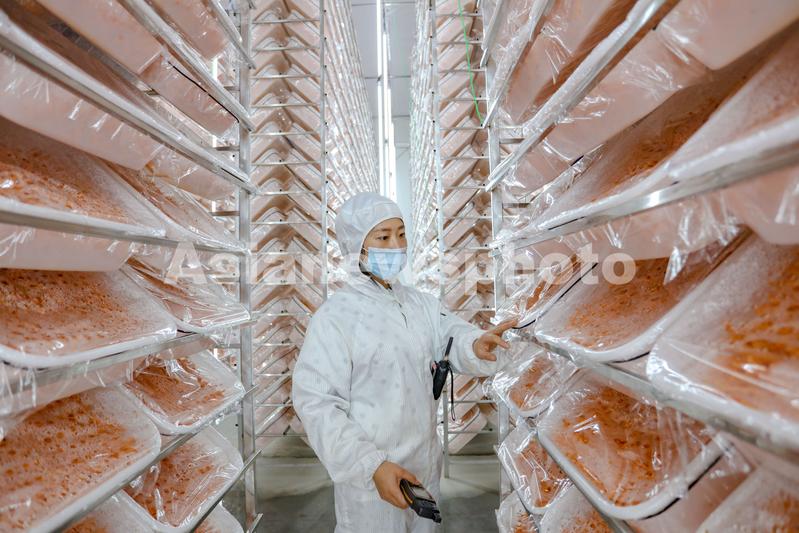 2020年8月7日,四川省遂宁市蓬溪县天福镇琪英菌业虫草花工厂内,工人在查看虫草花生长情况。