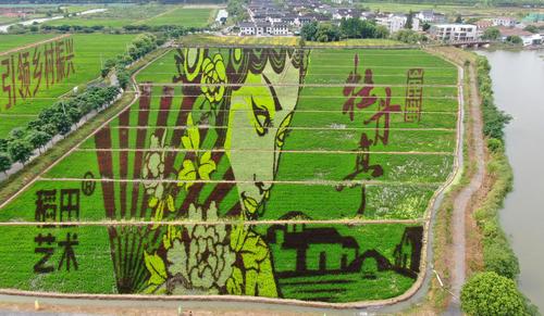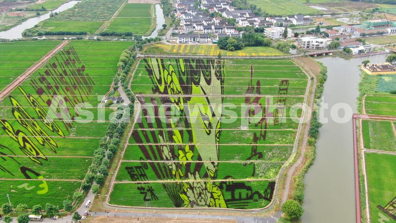 2020年8月8日,航拍江苏昆山张浦镇尚明甸村3D稻田艺术画昆曲“牡丹亭”。