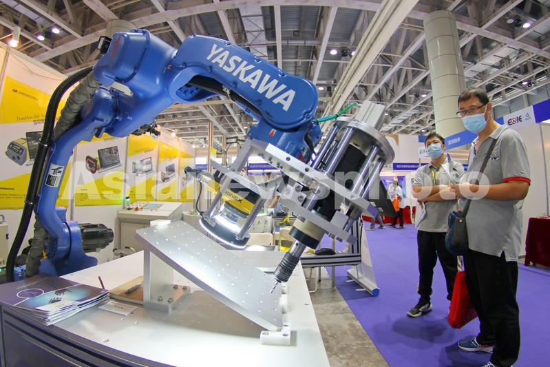 2020年8月13日,观众在第十八届烟台国际装备制造业博览会上观看机器人攻丝机。