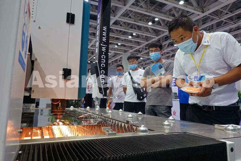 2020年8月13日,参展商在第十八届烟台国际装备制造业博览会上展示激光切割机。
