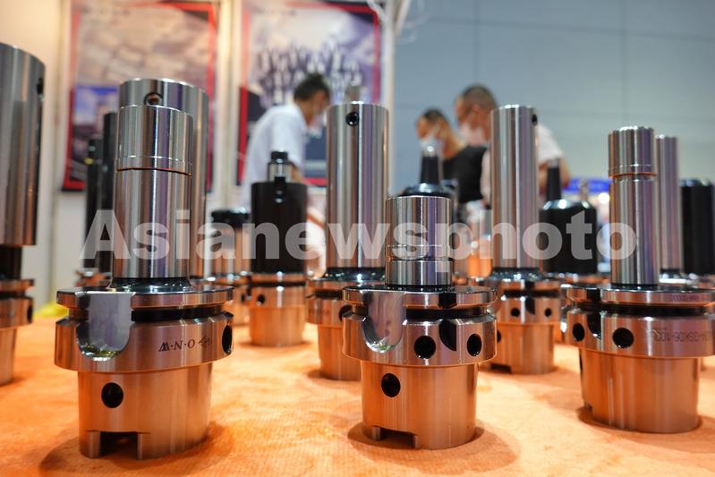 2020年8月13日,参展商在第十八届烟台国际装备制造业博览会上展示机床设备刀具。