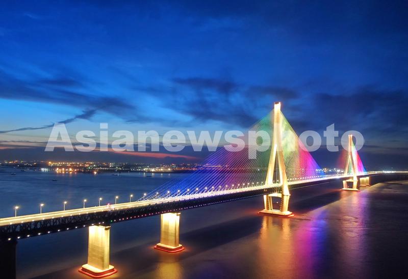 图片说明:2020年8月12日晚拍摄的沪苏通长江公铁大桥夜色。