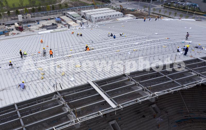 2020年8月8日,进入施工后期阶段的上海浦东足球场场馆项目现场,千余名建设者为足球场9月底建成全力冲刺。