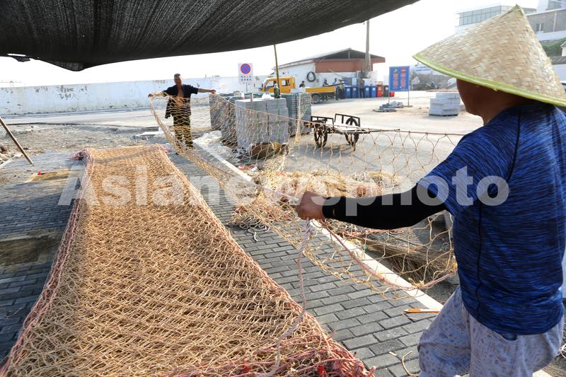 8月18日,连云港市连云区高公岛街道养殖户正在修补、整理养殖紫菜使用的网帘。