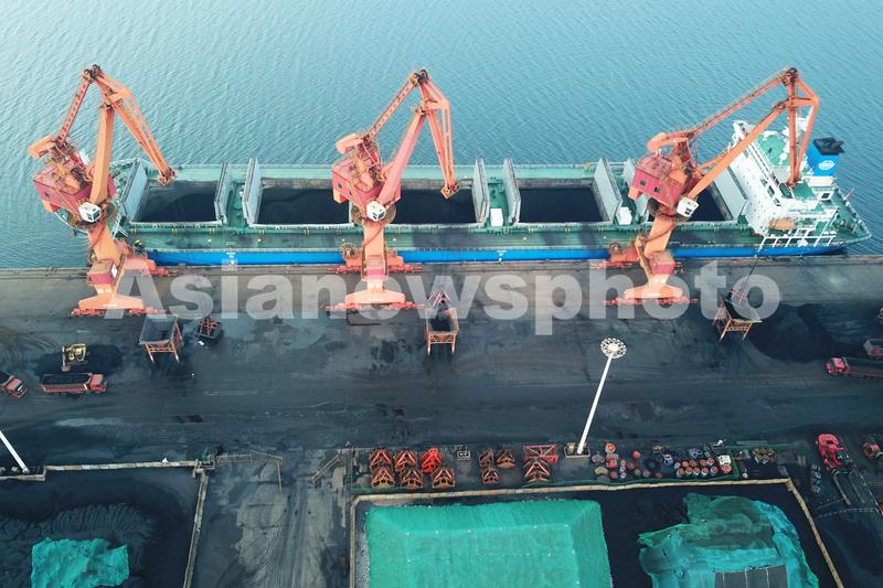 2020年8月19日,江苏连云港港煤炭码头,一艘货轮在卸载一批电煤。