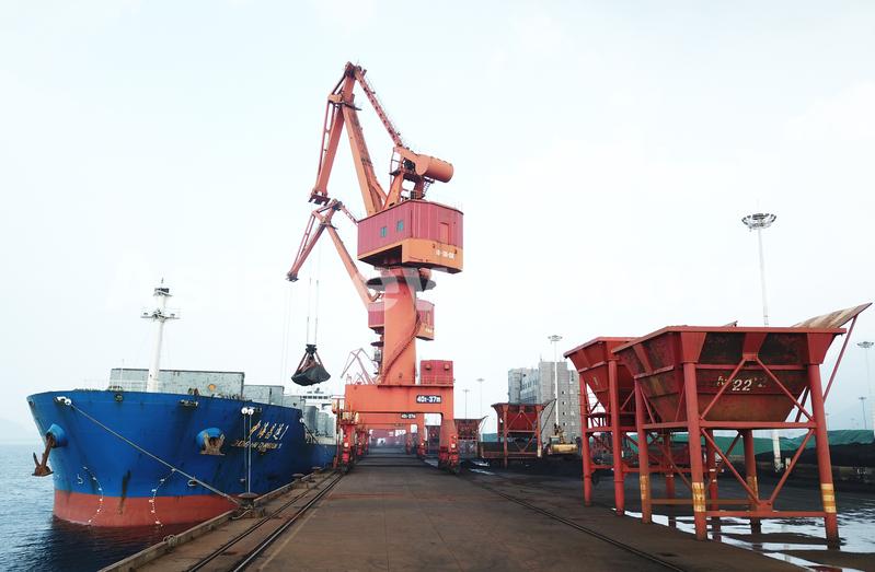 2020年8月19日,江苏连云港港煤炭码头,一艘货轮在卸载一批电煤。