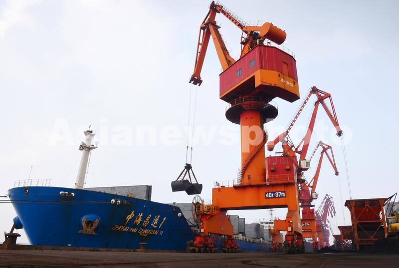 2020年8月19日,江苏连云港港煤炭码头,一艘货轮在卸载一批电煤。