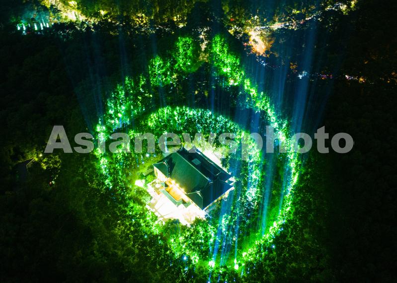 2020年8月25日晚,伴随着七夕紫金山漫步活动的举行,南京美龄宫景观灯再度被点亮,灯光照射在梧桐上,从空中俯瞰,犹如一条“宝石项链”镶嵌在南京城中。