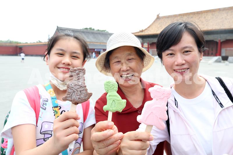 2020年8月27日,北京,三位游客在故宫展示 “脊兽”雪糕。