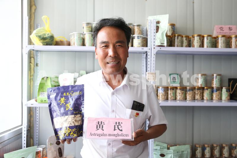 图片说明:9月1日,甘肃岷县茶埠镇益农中药材种植购销农民专业合作社内,合作社理事长、茶埠镇大竜村村主任邱富文向记者展示自己参加广交会时带去的黄芪产品。据他介绍,当时有许多外商表示很兴趣,临时加上了中药材的英文翻译。
