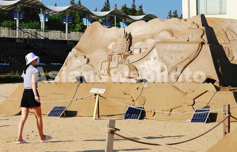 图片说明:2020年8月31日,上海金山城市沙滩举办的“四史”学习教育主题沙雕展宏伟壮观吸引眼球,代表新中国科技军事发展的“辽宁号”航空母舰主题。