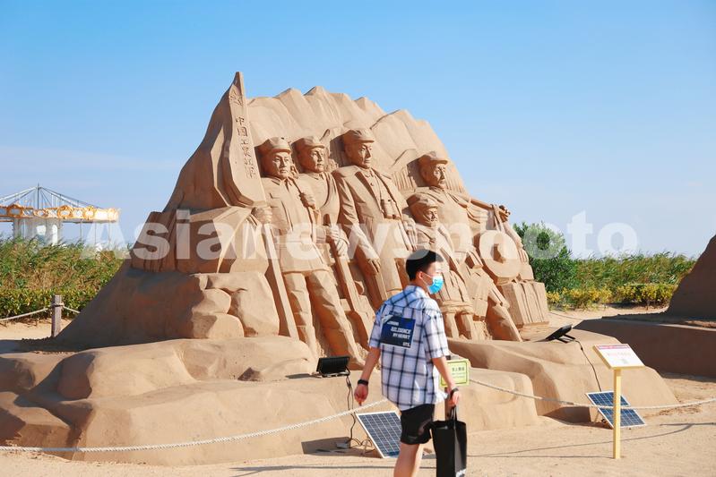图片说明:2020年8月31日,上海金山城市沙滩举办的“四史”学习教育主题沙雕展宏伟壮观吸引眼球,中国工农红军长征主题。