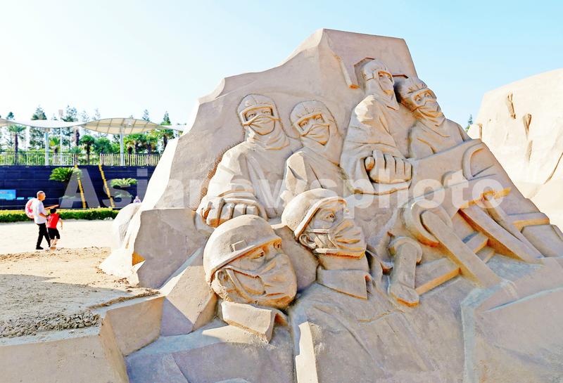 图片说明:2020年8月31日,上海金山城市沙滩举办的“四史”学习教育主题沙雕展宏伟壮观吸引眼球,中国医护等抗疫战士主题。