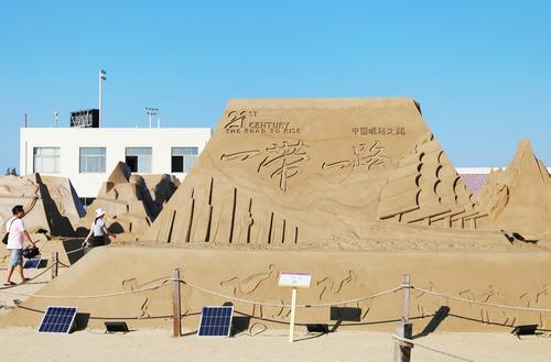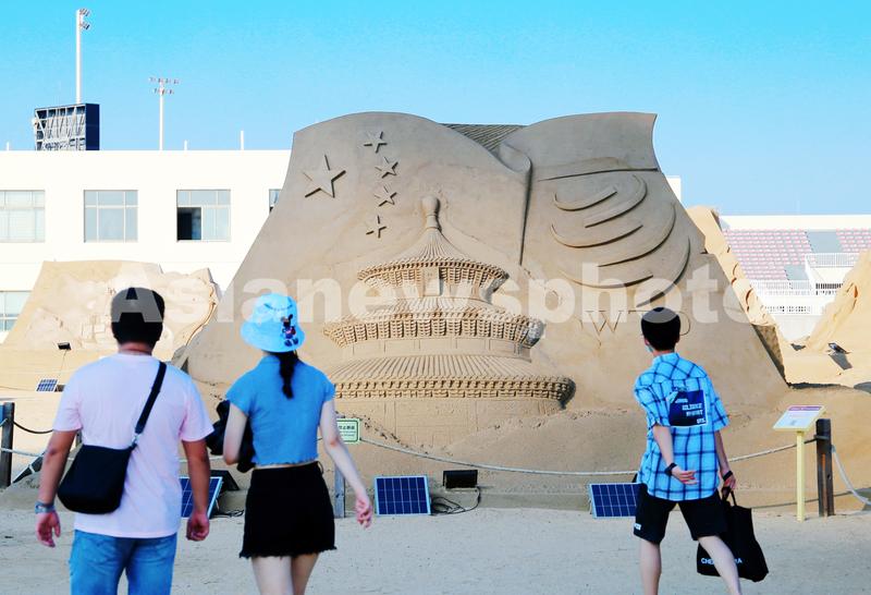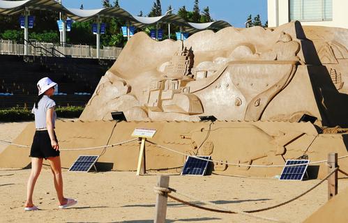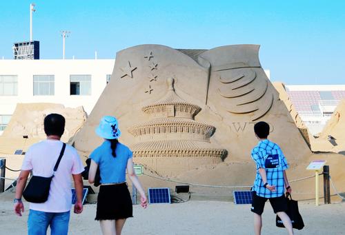 图片说明:2020年8月31日,上海金山城市沙滩举办的“四史”学习教育主题沙雕展宏伟壮观吸引眼球,WTO中国正式进入世贸组织主题。