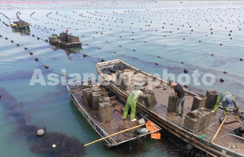图片说明:2020年9月10日,在山东省荣成市桑沟湾鲍鱼养殖区,养殖工人在采收鲍鱼。