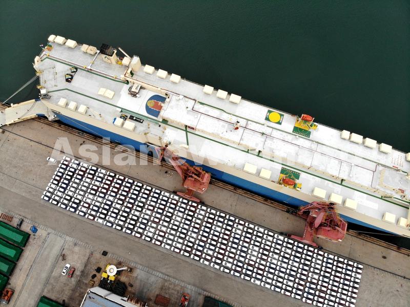 图片说明:9月10日,一艘远洋滚装轮在连云港港东方公司码头装载汽车出口埃及(无人机照片)。
