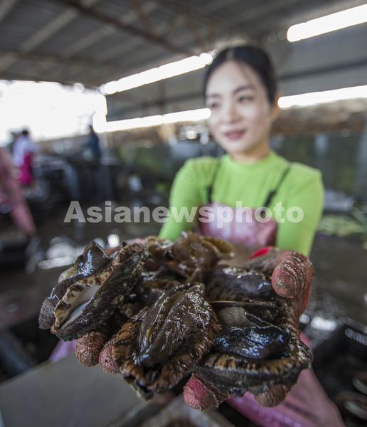 图片说明:2020年9月10日,在山东省荣成市桑沟湾鲍鱼养殖区,养殖工人在采收鲍鱼。