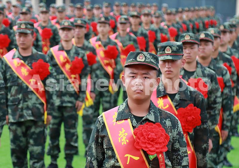 图片说明:2020年9月15日,在安徽省合肥市肥东县人武部举行的新兵入伍欢送仪式上。